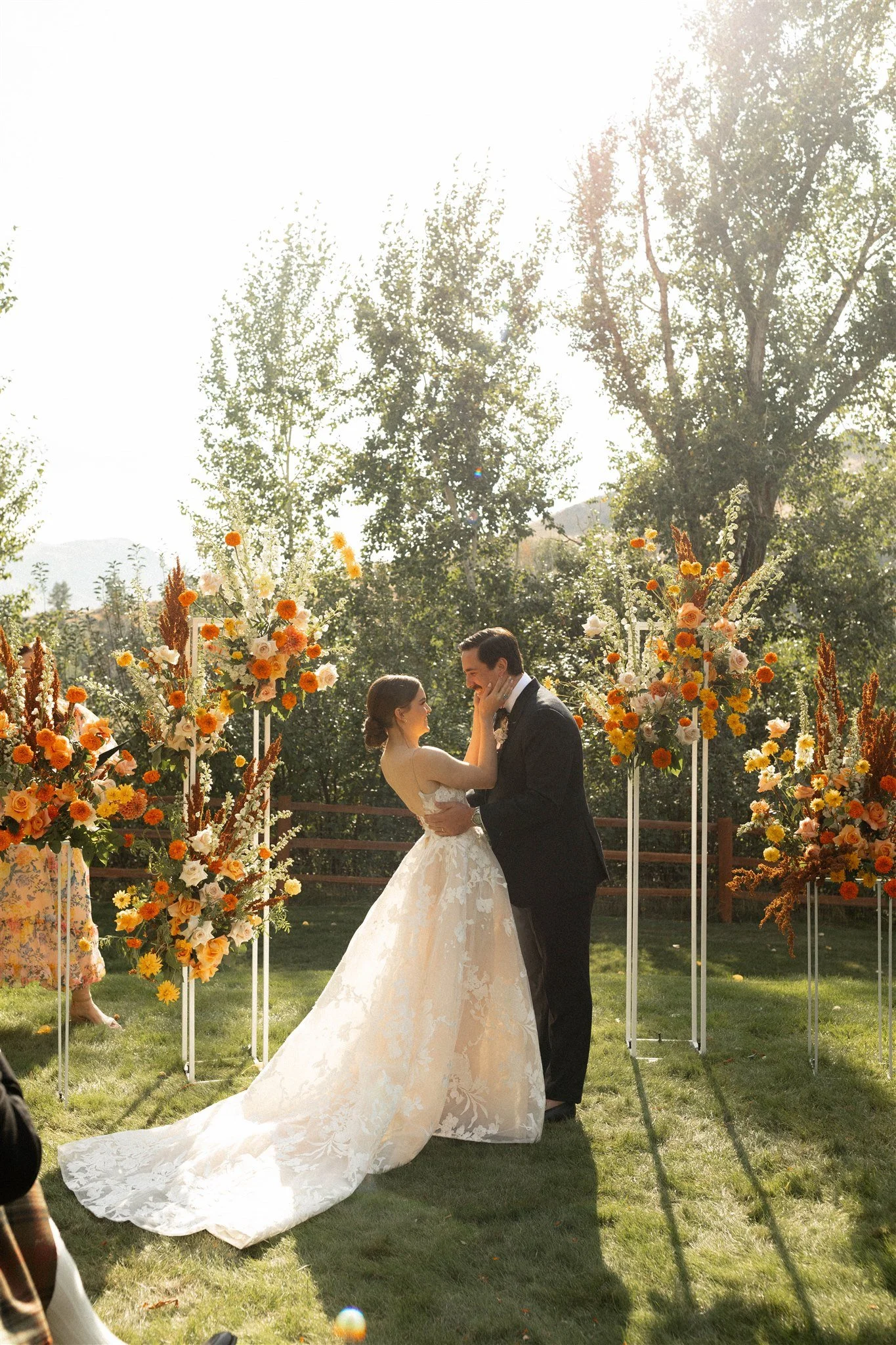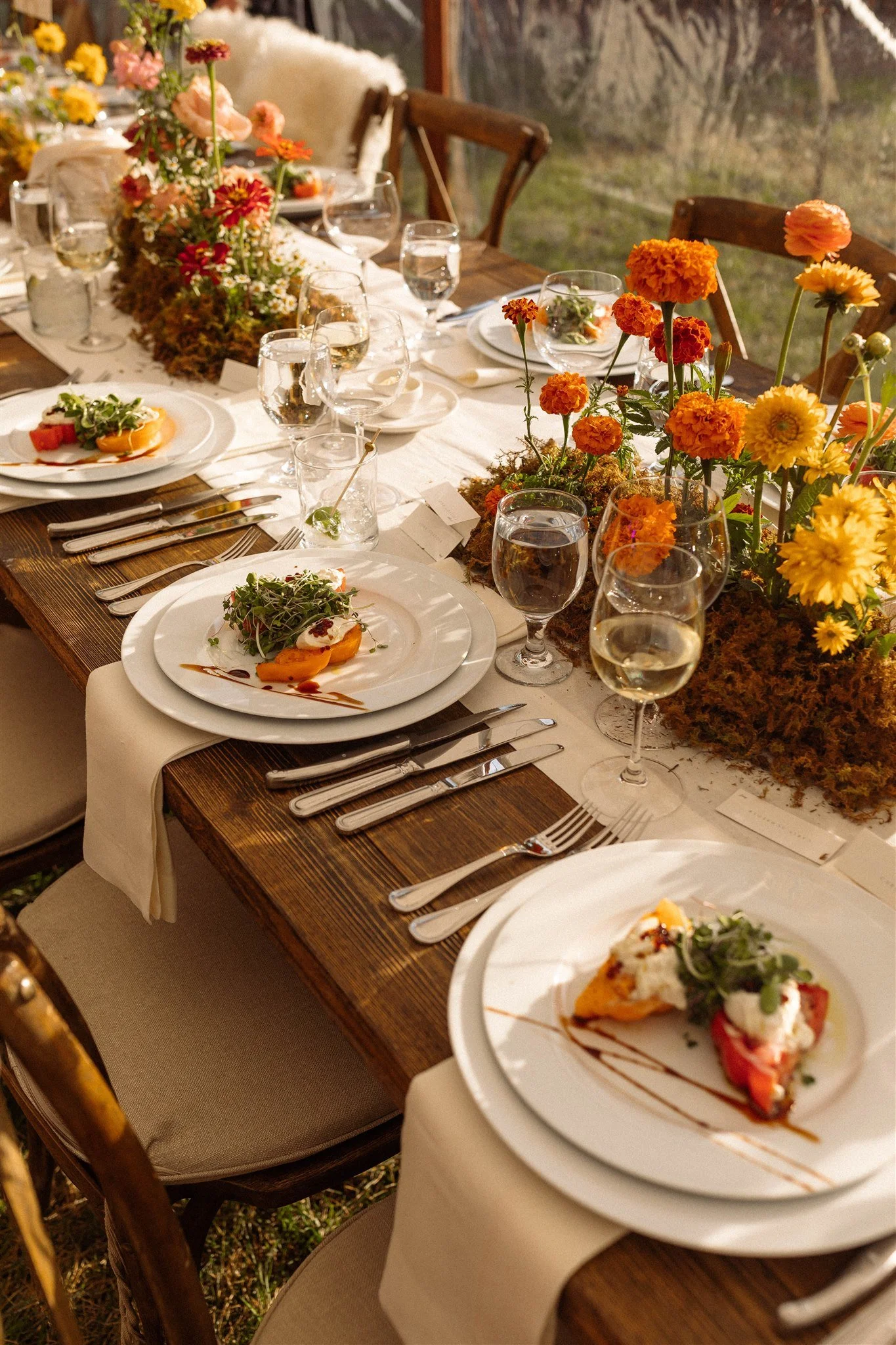 A whimsical and earthy aesthetic, featuring light airy tablescapes, local blooms, suspended greenery and a sunset inspired palette of blush, peach, orange red and apricot.