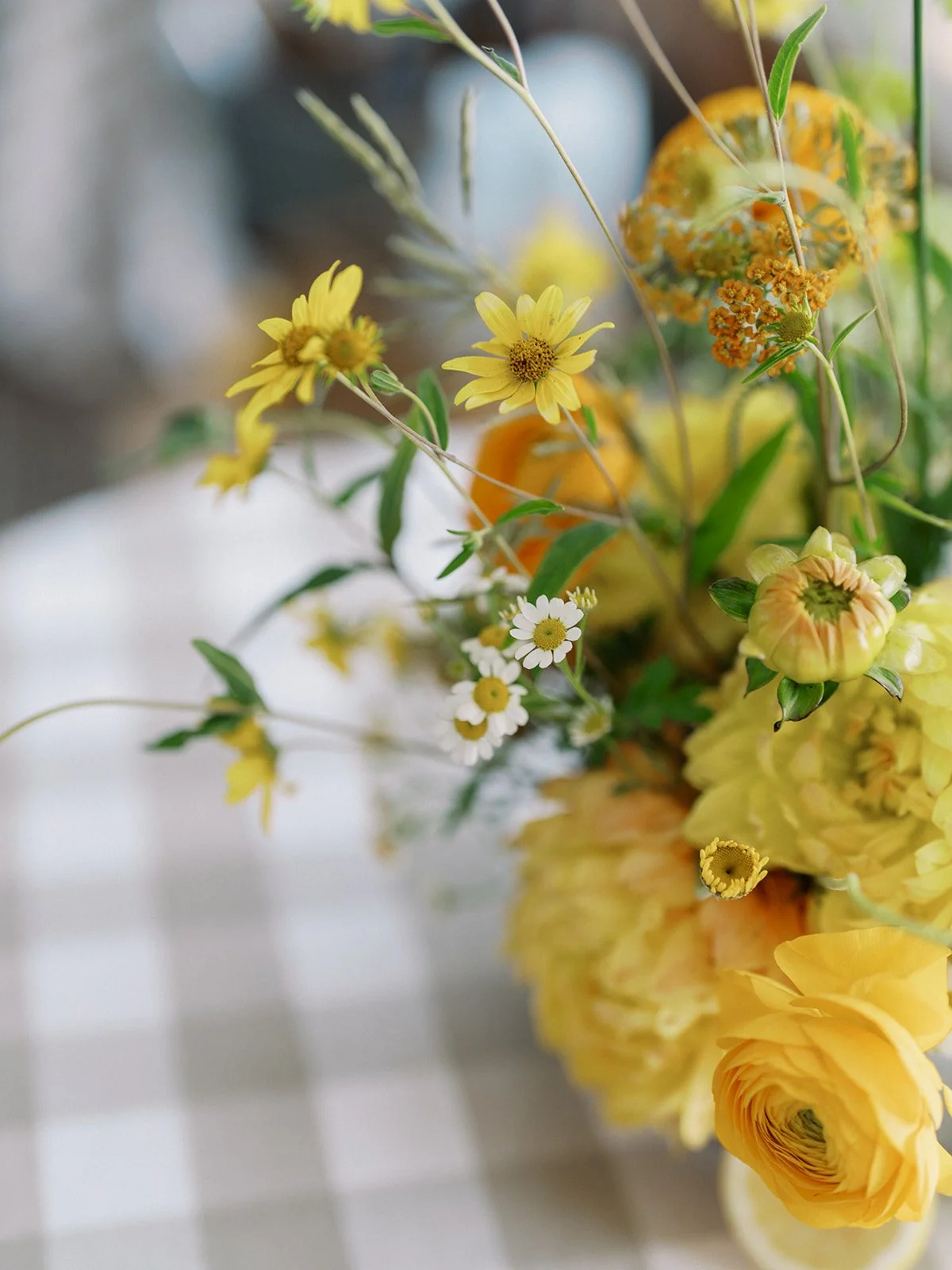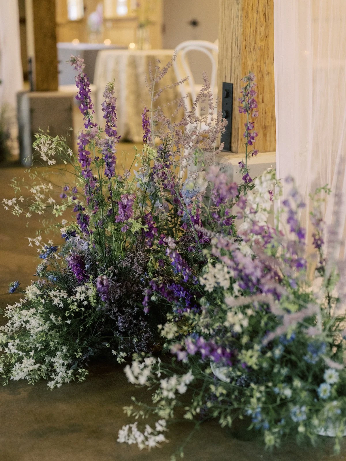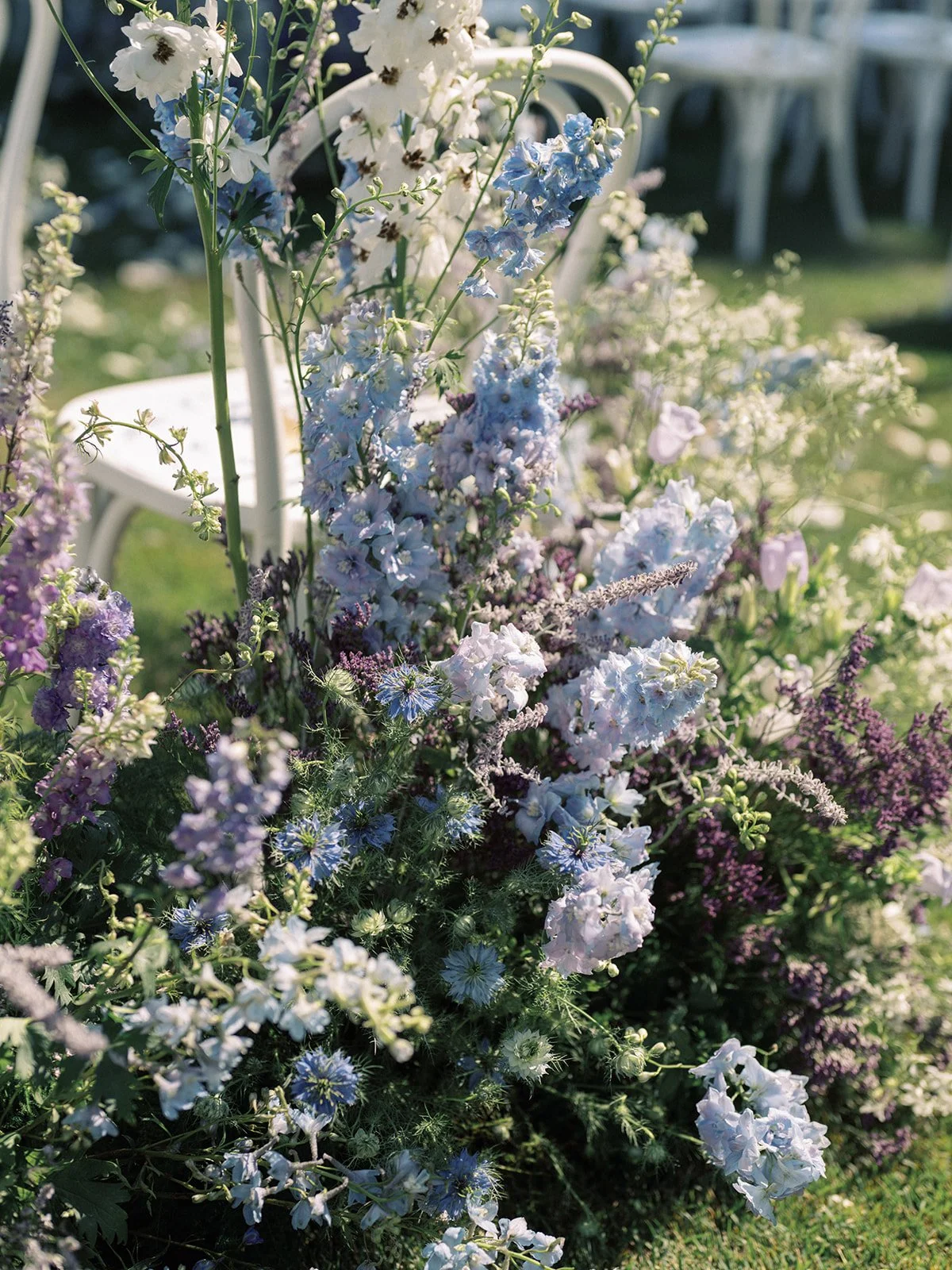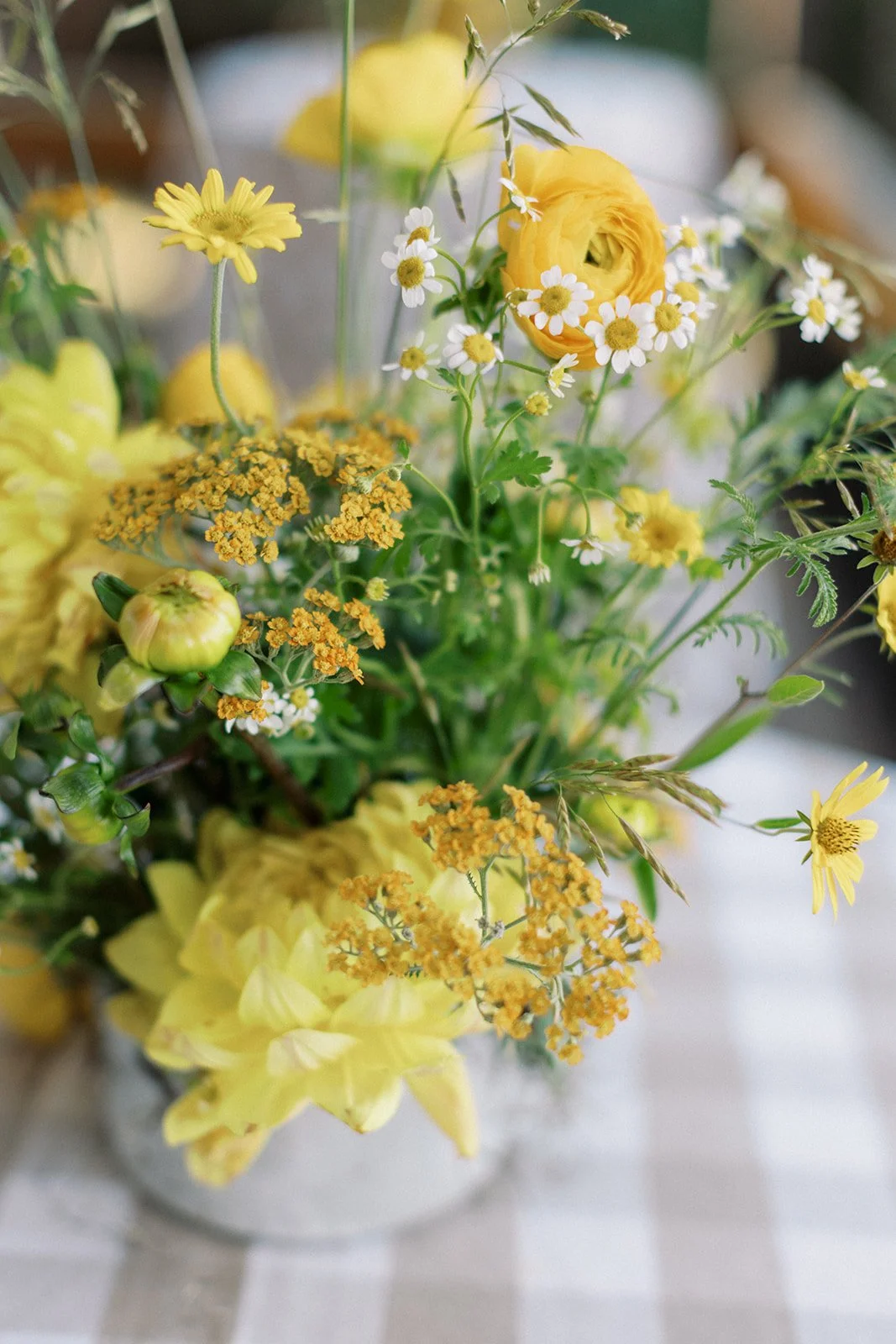 Wild, natural florals brought an effortless, contemporary feel to this four day celebration. Kicking off with the welcome party with a yellow palette featuring dahlias, chamomile and pops of citrus. Next up was the rehearsal dinner at Shore Lodge featuring textural whites and greens. A sunset toned tablescape created an intimate setting for the bridal luncheon. Finally the wedding day comprised of whimsical and airy wildflowers in shades of blues, purples and whites.