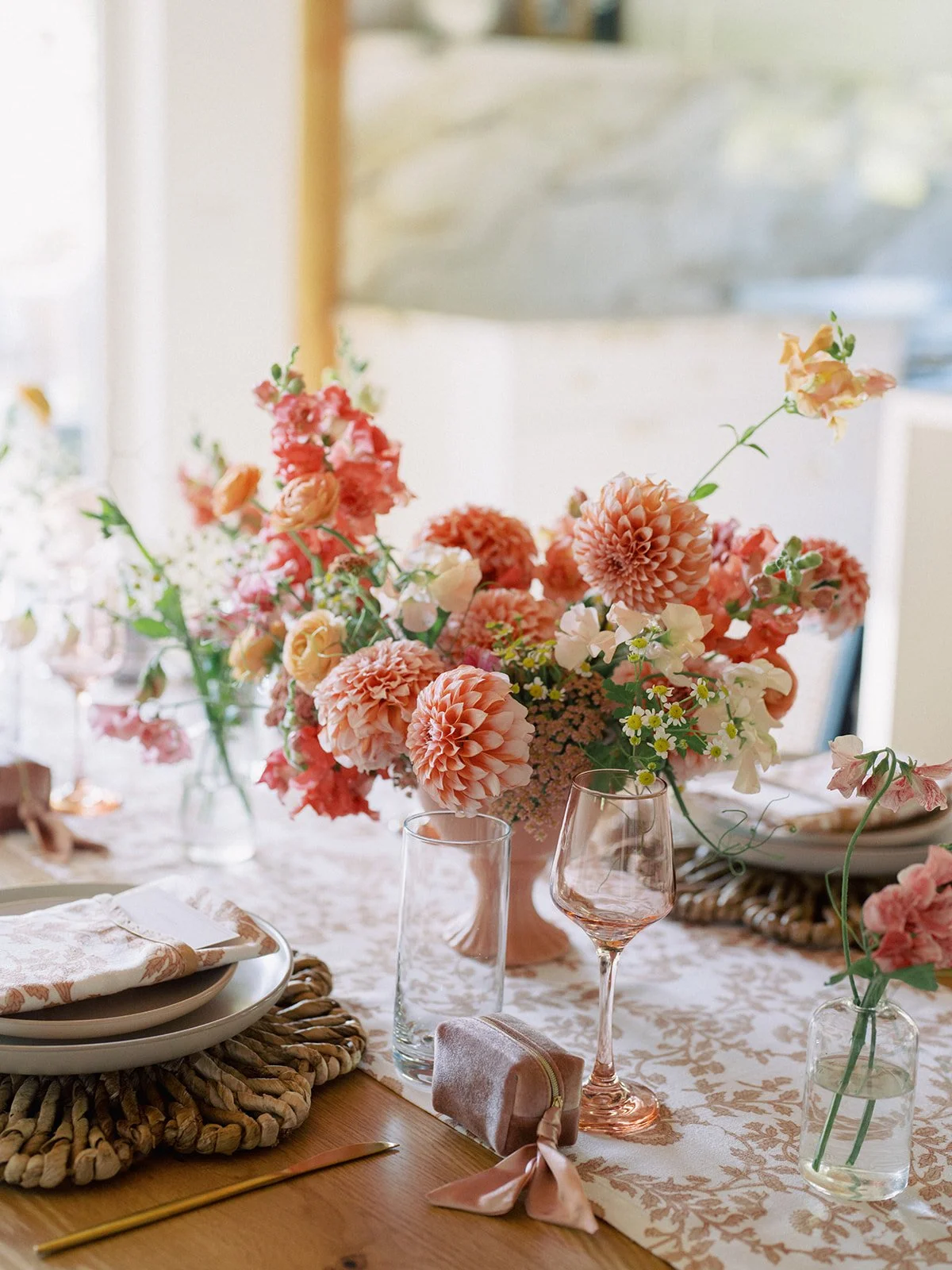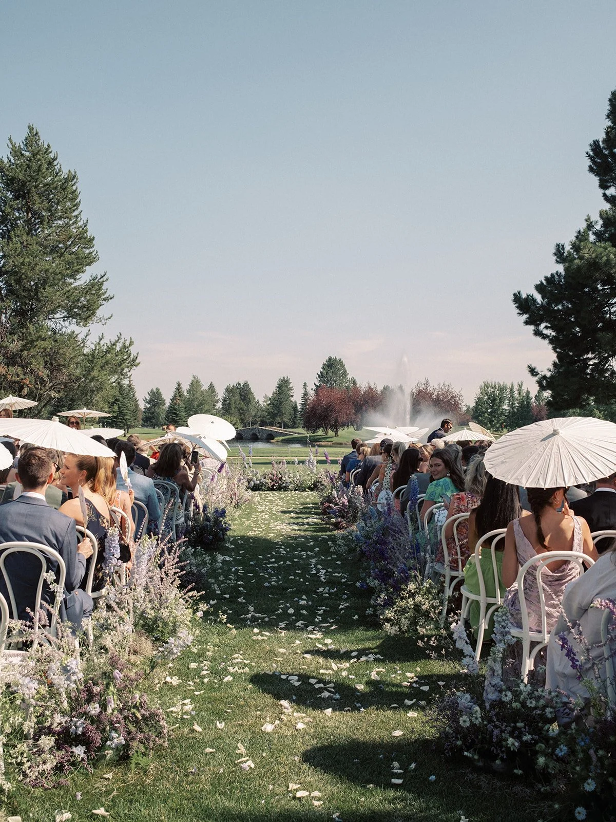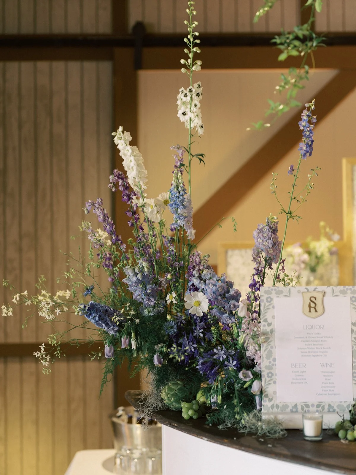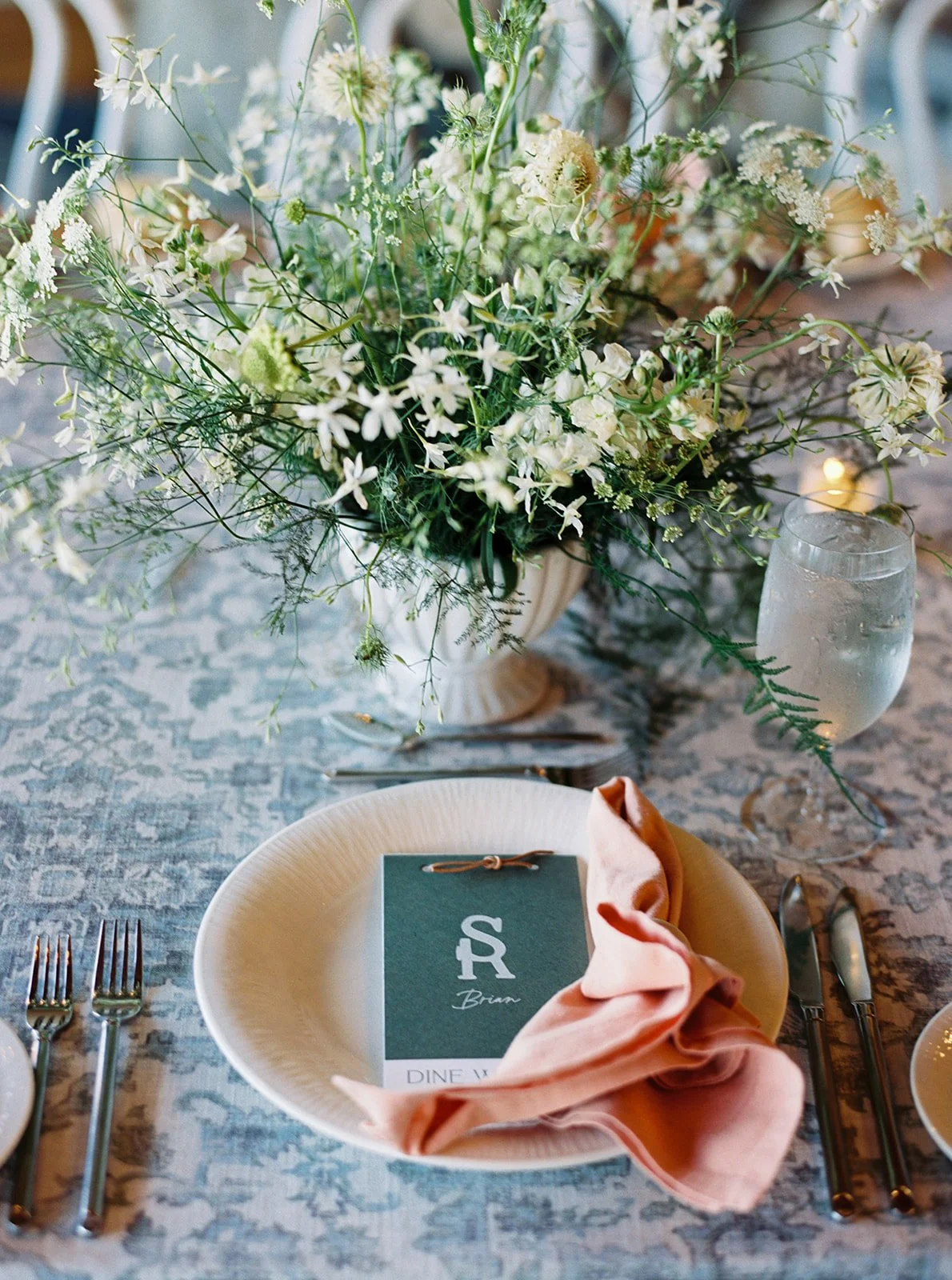 Wild, natural florals brought an effortless, contemporary feel to this four day celebration. Kicking off with the welcome party with a yellow palette featuring dahlias, chamomile and pops of citrus. Next up was the rehearsal dinner at Shore Lodge featuring textural whites and greens. A sunset toned tablescape created an intimate setting for the bridal luncheon. Finally the wedding day comprised of whimsical and airy wildflowers in shades of blues, purples and whites.